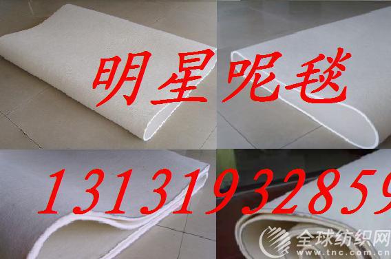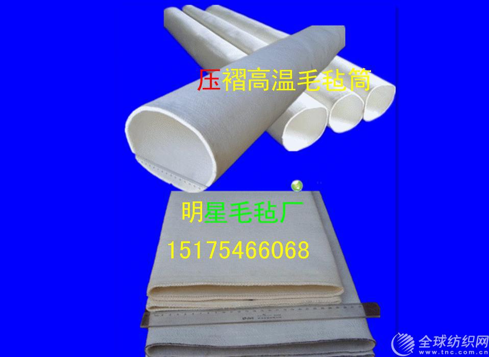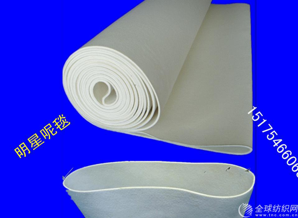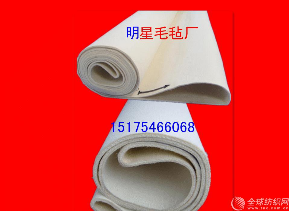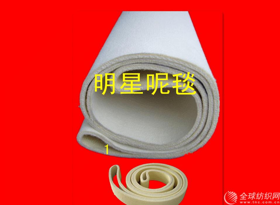 明星毛氈廠專業生產耐高溫100℃-350℃系列產品廠家。歷經十多年的積累,現已擁有多種專業設備,先進技術和完 善售后服務公司創立于1986年,自建立以來,在吸收原呢毯類企業產品優點的基礎上依靠技術人員的研發對各類呢毯內部基布結構進行了重大改造,采用了聚酯干網不易伸長,收縮的特性,替代了原有市場上呢毯生產慣用的毛棉,簾子線基布生產呢毯.為此公司生產的呢毯,套毯類產品具有門幅收縮概率小,周長不易伸長的特性,在耐高溫產品上選用美國杜邦公司生產的美塔斯化纖纖維.常溫產品上選用國產化纖纖維和羊毛.具體產品如下:耐高溫系列--轉移印花毯帶,轉移印花墊毯,預縮機毯,軋皺套毯,針織廠定型機套毯,皮革廠劑水機氈套 以及各類需耐高溫的呢毯、套毯. 公司產品已在印染針織、皮革、印花、洗滌、化工、 廣告、貼合、食品、包裝印刷、木業、鋼鐵等行業中 廣泛使用。我們的產品:毛氈帶,氈筒,編織帶,高 溫墊,選用優質的原料:polyester、nomex、kevlar、nylon、wool,選用不同的材料可加工出適用多種需求的工業產品。